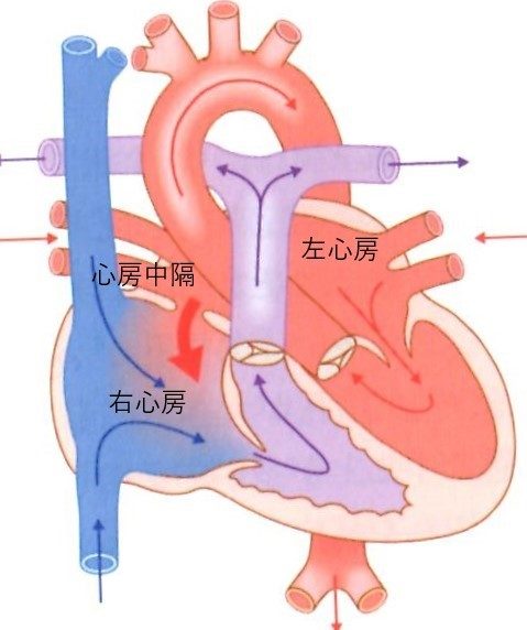 心房中隔欠損症は左心房と右心房の間の壁(心房中隔)が先天的に作られず欠損孔が存在するものである。こどもの時は多くの場合無症状で経過し、症状を呈するのは中年期以降です。左心房から右心房に血液がもれることにより右心系(右心房・右心室)に負担が生じる(図)。